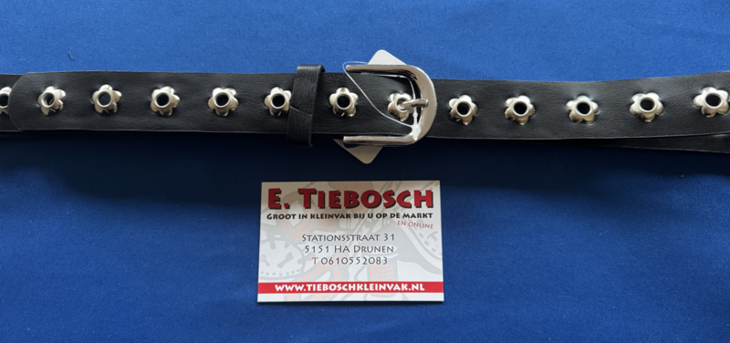 Dames riem 2,5 cm zwart met zilveren bloemgaatjesDames riem 2,5 cm breed 140 cm lang kleur zwart met zilveren bloemgaatjes